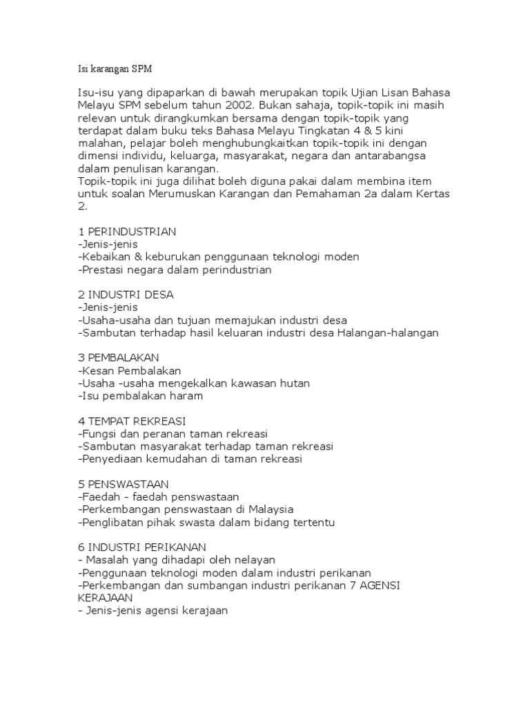 Isi Karangan Spm from imgv2-2-f.scribdassets.com Karangan ini ditulis sebagai kerja rumah yang diberikan oleh guru saya sepanjang bergelar seorang murid sekolah menengah (tingkatan 4 dan tingkatan 5). Langkah memajukan industri pelancongan negara lsektor pelancongan di negara kita berkembang maju dan menjadi sumber pendapatan negara yang penting. Teras keseluruhan dasar dalam sektor pelancongan ialah untuk mencapai pertumbuhan pelancongan yang mampan bagi merealisasikan potensi pekerjaan yang banyak dan kesan penjanaan pendapatan di tahap negara, negeri dan kawasan tempatan. Di samping itu, sektor pelancongan juga dapat memajukan bidang perniagaan di malaysia. Intihanya, sektor pelancongan merupakan sektor baru yang berpotensi untuk menyumbang pada ekonomi negara. 4.0 halangan / cabaran industri pelancongan. Untuk memajukan sektor pertanian, kaum petani kita perlu memiliki prakarsa untuk membuat perubahan atau sedia membuat reformasi terhadap sektor pertanian. Lalu, untuk pengambilan atau pengumpulan tugas dapat dilakukan di satu titik yang disepakati dan setiap guru akan mengambil tugas tersebut setiap minggu.