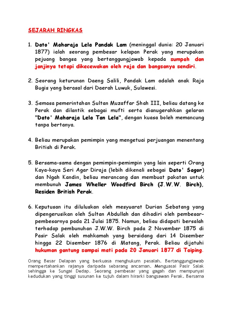 Contoh folio dato maharaja lela 7 contoh cute766. Pelantikan itu menimbulkan konflik antara birch, sultan dan pembesar perak yang mencetuskan kebangkitan di pasir salak. Dato' maharaja lela, dato' sagor, pandak induk dan seputum dihukum gantung sampai mati di matang pada 20 januari 1877. Pada november 1874 perak menerima residen british iaitu j.w.w.birch hasil daripada perjanjian pangkor. Sejarah tingkatan dua dato maharajalela pejuang kebanggaan perak.